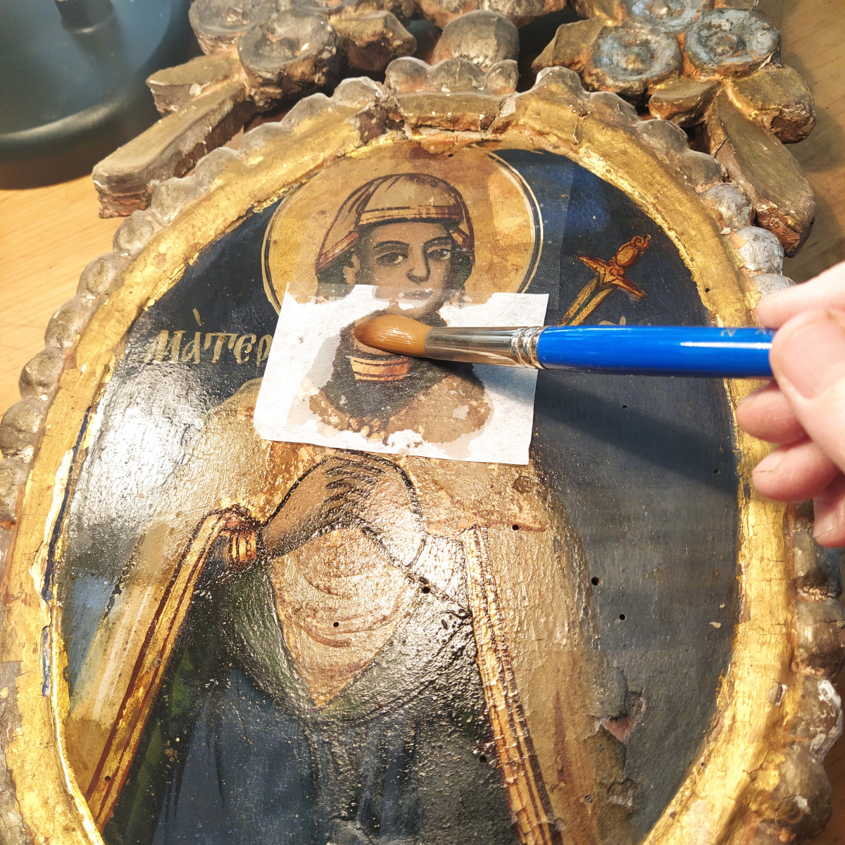 Конзерваторските истражувања и особено непосредната заштита се крунисани токму со овој труд посветен на иконостасната конструкција и иконите од црквата Св. Ѓорѓи Победоносец во Младо Нагоричане. Високата иконостасна конструкција се состои од три зони, на кои се поставени иконите. Над централниот премин е испишана годината 1872 и името на епитропот Крсте Аџин. На дел од иконите се зачувани натписи од кои се дознаваат имињата на приложниците, како и потписите на двајцата дебарски зографи Вено и Зафир, кои ги насликале иконите меѓу 1868 и 1873 година.